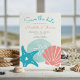 Beach Thema Hochzeit Save the Date Karte verfügt über Sand Dollar, Seestern (Seestern) und Jakobsmuscheln in tropischen Korallen und Aqua blau. Die Rückseite ist eine nautische Muschel, Wal Schwanz & Wirbel Muster auf einem türkisfarbenen Hintergrund. Ideal für Hochzeiten am Strand, im Wasser, an der Küste, im Sommer, am Meer und auf der Insel. Original-Kunstwerk KL Stock.