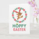This card shows a warm brown bunny mid-leap, with pink inner ears, rosy cheeks, and a fluffy round tail, smiling with a little tongue peeking out 🐰. Its open arms and bent legs give it the look of dashing in for a friendly hug, like it’s greeting someone it cares about. A circular wreath surrounds the bunny, made of green sprigs and soft pink egg-shaped accents that feel like gentle spring decorations 🌷. The wreath frames the bunny closely, like a tender little spotlight that keeps the focus on its cheerful face. Under the illustration, the text “HOPPY EASTER” sits centered near the bottom edge. “HOPPY” is in green with two small leaves growing from the “O,” while “EASTER” is in rosy pink to match the egg shapes and the bunny’s blush. The background is plain white, and the wreath’s greens and pinks form a neat ring around the bunny.