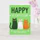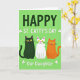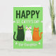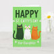 This card features three cartoon cats centered on an emerald green background, giving the scene a St. Patrick’s Day feel with a friendly, cozy spark 💚. At the top, the phrase “HAPPY ST. CATTY’S DAY” arches in white lettering, with small white shamrocks tucked around it like a simple frame ☘️. On the left, a sleek black cat with bright yellow eyes and a tiny pink nose leans in toward the others, as if joining a close-knit photo. In the middle, a white cat with lime-green spots sits snugly beside its friends, its soft pink ear interiors adding a gentle, affectionate touch. On the right, an orange cat rounds out the trio, angled slightly inward so the group reads like a warm little circle of friendship. Beneath the cats, the words “Our Daughter” appear in white text, placed low on the card and centered under the illustration. The cats’ paws, whiskers, and simple facial features are drawn with flat shapes and smooth edges, and the small shamrocks hover near the headline against the green field.