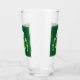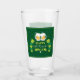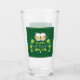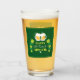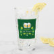 Trinken Sie Glas mit einem festlichen Happy St. Patrick's Day Design mit 2 Tasse frostigem Bier und ein paar Kleeblatten auf grünem Hintergrund.