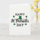 This card features a St. Patrick’s Day layout on a bright white background, with “HAPPY” at the top and “DAY” at the bottom in dark black lettering. Centered between them, “St. Patrick’s” appears in a smooth, flowing black style that feels like it’s gently wrapping the phrase in a friendly embrace. An emerald green leprechaun hat with a shiny gold buckle sits near the middle of the wording, like a cheerful little centerpiece everyone gathers around 💚. Four green shamrocks are placed around the main message, two on each side, creating a neat, balanced frame that feels like a pair of friends standing close for a photo ☘️. Small curling flourishes decorate the space around “St. Patrick’s,” adding motion and a light, airy touch without crowding the design. The contrast of black text against the white background makes the greens look richer, from the hat to the clovers. The hat’s curved brim and bright buckle stand out sharply against the surrounding black letters and the open white space.
