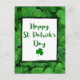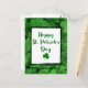 Eine Postkarte mit einem Happy St. Patrick's Day Design in einem trendigen grünen Schriftart. Ein grünes Klee unter dem Text. Der Hintergrund ist ein Feld von waldgrünen Klee.