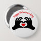 Celebrate the season of love with this striking and modern Valentine's Day pin button. The design features a bold black silhouette of two hands coming together to form a heart shape, framing a vibrant red heart in the center.