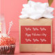 Roter Aufkleber hat eine Reihe von weißen Blume, die oben und unten verlaufen. Das weiße Skript sagt "Happy Valentine's Day"