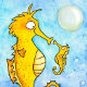 Der Hintergrund dieser Karte besteht aus zwei verschiedenen Blautönen, abwechselnd zu einem harmonischen Aquarellhintergrund. Hier und da steigen langsam Luftblasen an die Oberfläche. Im Vordergrund zwei gelbe Seepferd, ein kleines und ein größeres. Sie lächeln einander an. Der größere ist der Vater. Für Seepferde ist es das Männchen, das einen Beutel auf dem Bauch hat, gebären und die Babys tragen kann. Unter den beiden Seepferden wird "Happy Father's Day" in orangefarbenen handgeschriebenen Buchstaben geschrieben.