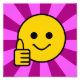 Spaß glücklich, gelb Daumen nach oben. Er hat schwarze Augenpunkte und einen niedlichen, frechen hellen und dunkelrosa Sonnenbursthintergrund.
