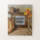 Happy Zuhause Cowgirl Cowboy Style Mit Cowboy Boots Puzzle (Edit). Cowboy oder Cowgirl Hut und Cowboy oder Cowgirl Stiefel, mit gelber Blume in einem rustikalen Rahmen. Sie können "Happy Zuhause" durch Ihren eigenen Text oder Ihre eigenen Initialen ersetzen! In Zusammenarbeit mit der KI produziertes Bild. Was für ein toller Sake für Geburtstage, Hauswärmung, Abschlüsse, Geburtstage, Hochzeiten und vieles mehr! Spiele, Puzzles