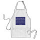 An apron with a blue background, with a latin and the English translation underneath. "Life grants to us mortals without hard work" by the Roman poet, Horace. Basically, you don't get anything if you don't work to achieve it.