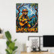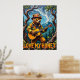 Dieses charmante Kunstwerk zeigt einen Bären, der als Feuerwehrmann verkleidet ist, mit Helm und Sonnenbrille, und spielt eine akustische Gitarre, während er auf einem robusten Zweig in einem üppigen Wald steht. Ein Glas Honig hängt von einem höheren Ast über ihm. Der Hintergrund zeigt hohe Bäume und Blätter in einem sanft beleuchteten Wald. Das Gemälde verwendet dicke, strukturierte Pinselstriche, die ein skurriles und herzzerwärmendes Gefühl verleihen, mit "Liebe My Honey", geschrieben unten.