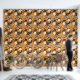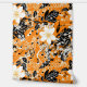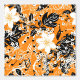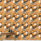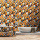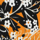 Ein nahtloses Muster mit großen weißen Blume, winzigen weißen Blume, schwarzen Blätter und kleinen schwarzen Musiknoten auf orangefarbenem Hintergrund. Das Design ist handbemalt und verbindet Blumenelemente mit musikalischen Motiven zu einer harmonischen und künstlerischen Komposition.