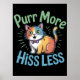 Diese bezaubernde Grafik zeigt eine fröhliche Cartoon-Katze mit auffallendem, farbgeblocktem Fell in blauen, orangen und weißen Flecken, die eine lila Bogen-Krawatte zeigt. Die Katze hat breite, ausdrucksstarke grüne Augen und ein fröhliches, offenes Lächeln. Der Text "Purr More Hiss Weniger" wird in zwei verschiedenen Farben präsentiert: "Purr More" in grün und "Hiss Weniger" in hellblau und plädiert für ein positives felines Temperament. Das Design ist Set auf einem soliden schwarzen Hintergrund. Digitaler Download nur für den persönlichen Gebrauch.