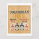 Diese Postkarte ist eine Reproduktion einer Vintagen Werbung für Harrisons kolumbianische Tinten in Rot, Blau, Schwarz und Scharlachrot.