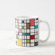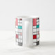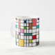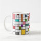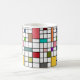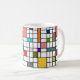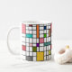 Diese Tasse hat ein modernes Design eines Gitters aus schwarzen Linien mit Quadraten und Rechtecken in Retrofarben auf einem weißen Feld.