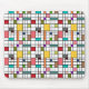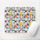 Dieses Mauspad hat ein modernes Design eines Gitters aus schwarzen Linien mit Quadraten und Rechtecken in Retrofarben auf einem weißen Feld.