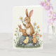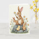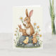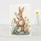 Diese Karte zeigt eine sanfte Frühlingslandschaft mit einem großen braunen Hasen, der aufrecht steht und eine kleine weiße Blume mit sonnigem gelben Zentrum anbietet, seine rosigen Wangen und das weiche Lächeln sind wie ein fürsorglicher Freund nach unten gerichtet 🐰. Darunter sitzen zwei kleinere Hasen eng beieinander auf kühlen grauen Felsen, ihre Körper sind nach innen geneigt, als ob sie einen stillen Moment teilen. Der linke kleine Hase schaut mit einer schüchternen, nachdenklichen Kopfneigung nach unten, während der rechte mit hellen, bewundernden Augen zu dem größeren Hasen aufblickt 🐇. Zwischen ihnen steht ein winziges gelbes Küken in der Mitte und bildet einen süßen Verbindungspunkt zwischen dem Trio. Um die Felsen und entlang des Vordergrunds sind grüne Stiele und Gräser mit weißen, gänseblümchenartigen Blüten getupft, die die Gruppe wie eine Gartenumrandung einrahmen. Der Hintergrund bleibt ein weiches Elfenbein, wodurch die warmen Brauntöne, sanften Grautöne und frischen Grüntöne ohne Ablenkung hervorstechen. Ein kurzer Ostergruß befindet sich nahe