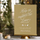 Erschwingliche, maßgeschneiderte Hochzeitsschild personalisiert mit Ihrem Hochzeitshashtag für Gäste, die ihre Fotos mit Ihnen auf Social Media teilen. Behalt das schick-gold-weiße Farbschema mit elegantem Kalligraphie-Script-Schriftart, wie gezeigt, oder nutze die Designwerkzeuge, um eine andere Hintergrundfarbe zu wählen, perfekt zu Ihrem Hochzeitsthema. Fügen Sie einen Rahmen an der Kasse hinzu oder wählen Sie eine benutzerdefinierte Postergröße, um einen beliebigen Rahmen zu bilden.