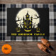 Set the perfect spooky scene at your doorstep with this eerie Halloween doormat featuring a haunted house, creepy cemetery, three glowing-eyed pumpkins, and a full moon shining in the background. A chillingly fun way to welcome guests and trick-or-treaters! Personalize it with your family name for a hauntingly unique touch.