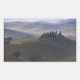 Rechteckiger Aufkleber mit einem Bauernhaus am Nebel des Morgengrundes in der Toskana zwischen den sanften Hügeln des Val d’Orcia zwischen Pienza und San Quirico d’Orcia in Italien.