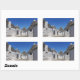 Rechteckiger Aufkleber aus Foto mit klassisch weißen Gipshäusern mit Steinplatten in konischen Dächern in einer kleinen Straße in Alberobello, Itria Tal in Puglia, Italien.