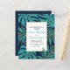 BUDGET aquamarin, Marineblau und Gold tropische Monstera und Palmen Blätter Hochzeit Einladung mit QR-Code, um UAWG online. Es zeigt ein Muster tropischer Blätter in aquamarinem Blau mit goldener Kontur auf Marineblau und dem Text in einem weißen Rahmen. Auf der Rückseite befinden sich ein goldenes Polka-Punktmuster auf marinem Hintergrund und der QR-Code.
