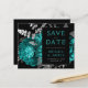 Diese elegante, stimmungsvolle Hochzeit Save the Date-Karte bietet einen üppigen, romantischen Blumenstrauß in aquamarinem Blau mit silbernen Imitate-Folie und Glitzer-Blattwerk auf einem schwarzen Hintergrund. Passen Sie den silbergrauen und aquamarinen Text in stilvollen Schriftart auf einem schwarzen Rechteck an. Fügen Sie zusätzliche Details auf der Rückseite, und geben Sie Ihre Hochzeitswebsite URL, um einen QR-Code zu generieren.