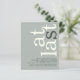 Eine günstige BUDGET-Alternative für eine kleinere Größe von 4,5 x 5,6 Zoll, die ein Gewicht von 110 lbs hat, die ähnlich dick ist wie eine Postkarte (sie ist jedoch nicht als Postkarte geeignet). BITTE BEACHTEN SIE, DASS ES EINE Einladung pro Blatt gibt. Auf der letzten QR-Seite Sage Elfenbeintext Engagement Party Ankündigung und Einladung. Ein modernes typografisches Design, mit At Last in großer Typografie gedreht und auf der rechten Seite oben, in Elfenbein mit Grau für den Buchstaben "s" auf einem Hintergrund von weichem Salbei grün. Die Hintergrundfarbe kann auf jeder Seite geändert werden, wenn Sie es über Weitere Anpassungen wünschen. Diese Einladungsversion ist unter Berücksichtigung der Partys, die in einem Hotel oder Restaurant (oder einem beliebigen Ort mit einer Website) stattfinden, den QR-Code auf der Rückseite durch einen QR-Code auf ihrer Website zu ersetzen, um es den Gästen zu erleichtern, Anleitungen usw. zu finden. Sie können QR-Codes kostenlos online erstellen. Suchen Sie "QR Code Creator" und viele Optionen werden kostenlos erstellt. Sie können auch den QR-Code und den Text auf der Rückseite löschen, wenn nicht durch weitere Anpassung erforderlich.