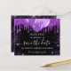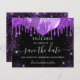 Eine gmädchenhafte und trendige Save the Date-Karte für eine Quinceañera, 15. Geburtstagsfeier. Schwarzer Hintergrund mit lila Imitaten Glitzer Tropfen, Glitzern und Ballons. Personalisieren und fügen Sie Datum und Name/Alter hinzu. Der Text: Save the Date ist mit einem großen angesagten, handgeschriebenen Stilskript geschrieben.