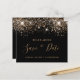 Eine gmädchenhafte und trendige Save the Date-Karte für eine Quinceañera, 15. Geburtstagsfeier. Ein schwarzer Hintergrund mit goldenem Imitat-Glitzer. Vorlagen für Datum, Namen und Text. Goldene Buchstaben. Der Text: Save the Date ist mit einem großen angesagten, handgeschriebenen Stilskript geschrieben.