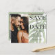 Elegante Ankündigung Datum freihalten ist perfekt, um Ihre Hochzeitspläne in Gang zu bringen. Es verfügt über eine Fotovorlage und eine große "Save the Date" Typografie mit dem Zusatz eines vergrößerten Monsterablattes in Aquarellfarbe, alles auf einem weißen Hintergrund. Passen Sie Ihre persönlichen Daten an.