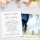 Eine preisgünstige Veranstaltung oder kleinere Hochzeitsankündigung, um Familie und Freunde darüber zu informieren, dass sich Ihre Hochzeitspläne geändert haben, und Sie haben bei Ihrer Hochzeit die Anzahl der Gäste erhöht oder reduziert und sie zu einem Hochzeitsempfang oder Party eingeladen. Die Vorderseite zeigt "Happily Ever After Party" in einer Mischung aus einfacher Typografie und einem eleganten Drehbuch mit Swashes, und Sie können Ihre Nachricht und Einladung detaillierter und Ihre Namen in einem signaturähnlichen Skript personalisieren. Auf der Rückseite finden Sie Ihr Lieblings-Foto, Ihre Vornamen und Ihr Hochzeitstermin.