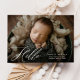 Budget Simple Calligraphy Script Hello Foto Baby Birth Announcement beinhaltet das volle Foto Ihres Babys auf der Vorderseite, zusammen mit dem trendigen weißen Kalligraphie Overlay. Die Rückseite enthält ein weiteres Foto und zusätzlichen Text.