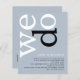 Eine günstige BUDGET-Alternative für eine kleinere Größe von 4,5 x 5,6 Zoll, die ein Gewicht von 110 lbs hat, die ähnlich dick ist wie eine Postkarte (sie ist jedoch nicht als Postkarte geeignet). BITTE BEACHTEN SIE, DASS ES EINE Einladung pro Blatt gibt. BUDGET Einfaches QR Code Dusty Blue Text Wedding Einladung. Fügen Sie Ihren QR-Code zu Ihrer Hochzeitswebsite auf der Rückseite hinzu, damit Ihre Gäste alle Details online sehen können, ohne separate Gehäuse benötigen zu müssen. Ein modernes typografisches Design mit We Do in großer Typografie in Weiß mit dem"d" in schwarz, rotiert und auf der links Seite auf einem Hintergrund von hellstaubblauem. Hintergrund- und Textfarben können auf Wunsch über Weitere Anpassungen geändert werden.