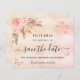 Eine gmädchenhafte und trendige Save the Date-Karte für eine Quinceañera, 15. Geburtstagsfeier. Rosa, goldene Rose mit rosafarbenen Blumen, Pampasgras und Schmetterlinge. Personalisieren und fügen Sie Datum und Name/Alter hinzu. Der Text: Save the Date ist mit einem großen angesagten, handgeschriebenen Stilskript geschrieben.