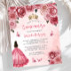 Diese schöne Quinceañera Einladung zeigt eine Grenze von rosa Rosen auf einem rosa Aquarell Hintergrund. Eine goldene Tiara, ein dunkelhaariges Mädchen in einem rosa Prinzessenkleid und kleine rosa Schmetterlinge schmücken den Text. Das Wort "Quinceañera" und der Name des Ehrengast erscheinen in eleganter rosa Handschrift, der Rest in grau sans serif Schriftart.