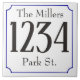 Hausnummer mit Straßen- und Familiennamen oder Handelsnamen. Blauer Rahmen