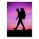 Silhouette d'un randonneur avec le sac à dos contre un coucher du soleil pourpre