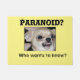 Manchmal muss man ein wenig herumwittern, um sich um die Blues zu kümmern. Schütteln Sie sie so ab wie diese Chihuahua mit dem wackeligen Paranoid-Text mit Paranoid Paco. Es ist wirklich nicht so schlimm...verriegeln Sie die Türen, Karo der Fenster und hunkern Sie unter den Blättern, um einige Seifenopern zu sehen. Man wird dich nicht sagen. Lass dem kleinen Hund inspirier dir, deinen eigenen Text und Schriftart zu erstellen, wenn du will.