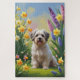 Ein fröhlicher Hund sitzt friedlich auf üppig grünem Gras, umgeben von bunten Frühlingsblüten unter einem weichen blauen Himmel. Dieses digitale Ölgemälde erfasst einen ruhigen Moment mit ausdrucksvollen Pinselstrichen, warmen Farben und einem Gefühl sanfter Freude.