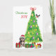 An der Vorderseite dieser Weihnachtskarte trägt ein bezaubernder, grau-weißer Hund aus Havanna einen rot-weißen Weihnachtshut, während er neben einem Holiday Baum sitzt. Britisch verpackte Geschenkpakete sind verstreut, und ein Stierstein landet auf dem Weihnachtsbaum. Der rote und grüne Text sagt "Christmas JOY". Inside ist stilisierter Text, der MERRY CHRISTMAS sagt, und ein Textfeld für Sie anpassen.