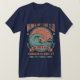 Catch the ultimate wave with this stunning retro Hawaiian surf graphic tee. Featuring a bold surfer riding a massive curling ocean wave under a glowing sunset, framed in a rope circle badge with tiki masks, seashells, and tropical palm trees — all rendered in that gorgeous faded vintage surf style.