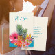 Carte de remerciements de jeunes mariés avec des fleurs hawaïennes et des ananas. De jolies fleurs frangipaniennes et un hibiscus et un oiseau de paradis entourent deux ananas au centre de ce design sur des cartes plates avec du texte personnalisable à l'avant et à l'arrière. Ecriture bleu Aqua avec "merci" sur le devant et un message et une signature sur le dos. Choisissez des options imprimées ou téléchargeables, ou les deux.