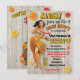 Super lustige Hawaiian Luau Birthdayparty Einladungen mit einem Vintagen Hula Mädchen und Hibiskus Blume vor einem verwitterten Holzhintergrund. Im hinteren Teil befindet sich eine Ukulele aus Holz.