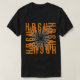 Ein dynamisches T - Shirt-Design mit einem wirbelnden Muster überlappender Buchstaben, in erster Linie "H", "B", "C." und "U" Die Buchstaben sind chaotisch, aber visuell ansprechend angeordnet und schaffen ein Gefühl von Bewegung und Energie. Die kontrastierenden Orange- und Grautöne verleihen dem Design mehr Tiefe und Dimension.