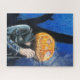 Ein kurioses, Halloween-Puzzle mit dem pastellfarbenen Kunstwerk "Der Headless Biker". Diese Abbildung zeigt einen Kürbiskopf, der eine Lederjacke trägt und eine Zigarette an einer kalten, dunklen Oktobernacht raucht. Originelle Bilder: Pastelle auf Papier. Copyright Dominic A. White. Alle Rechte vorbehalten.