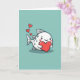 This card shows a sweet, human-like fish with a rounded white body dotted with soft gray spots, centered on a wide teal background. It holds a large red heart close to its chest as if hugging it tight, giving the scene a gentle, affectionate feel ❤️. The fish’s simple eyes and wide smile, along with rosy cheeks, make it look like it’s beaming at someone just out of view 🥰. Three smaller red hearts drift above its tail, like little kisses rising into the air. There’s no greeting text on the front, leaving the teal space open and calm while the reds stand out. Crisp outlines keep the shapes clear and graphic, and the teal backdrop stays smooth and uncluttered. A small, flat shadow sits beneath the fish, grounding it against the teal field.