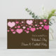 N'attendez pas pour une célébration de la Saint Valentin et partagez ce que vous ressentez avec cette merveilleuse invitation de fête de la Saint Valentin. Un éparpillement de taille variable et de coeurs roses accrochent sur des cordes contre brun riche avec l'invitation à vous rejoindre à votre dîner de Saint Valentin ou à votre cocktail. Les coeurs suspendus sont répétés à l'envers pour contrebalancer les informations de partie customisée. Disponible en couleurs alternatives avec des produits correspondants.