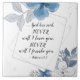 Die Keramik der Inspirationsschrift zeigt ein einfaches, blumenfarbenes Design mit einem modernen Doppelrahmen, der mit blauen und grauen Blume und Blätter geschmückt ist. Es verfügt über Bibel Verse Hebräisch 13:5, ... Gott hat gesagt: "Nie werde ich dich verlassen, nie werde ich dich aufgeben."