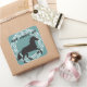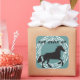 Niedliche schwarze Silhouette eines Pferdes vor einem aquamarinen Hintergrund und umgeben in einem Vintagen Stil Kreis. Die Worte "Yom Huledet Sameach" (Happy Birthday in Hebräisch) passen zur schwarzen Silohuette.