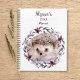 Ce mignon planificateur animal a l'année et votre nom monogrammé dans un script cursif moderne, au-dessus d'une aquarelle illustration d'un adorable hérisson et une couronne botanique de fleurs et de feuilles roses, mauves et violets, sur un arrière - plan blanc. Vous aimerez ce planificateur de calendrier à la mode et thématique nature. Les articles correspondants sont disponibles dans notre boutique.