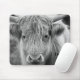 Eine Mausunterlage mit einem Schwarzweiss-Bild von einer der berühmten Hochlandkühe von Schottland.